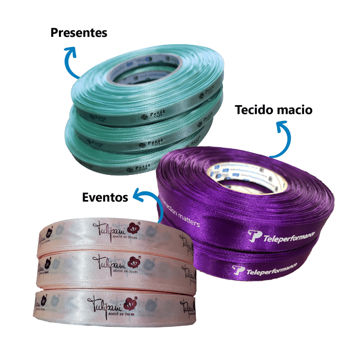 - Fita de cetim personalizada: macia, brilhante e com ótimo custo-benefício. Ideal para sublimação e impressão de logos.